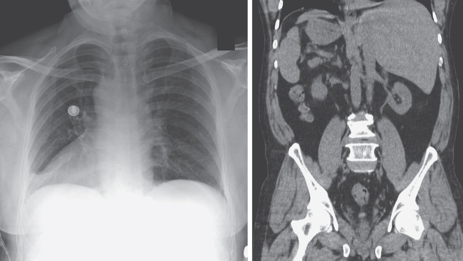 A 66-year-old man presented to the emergency department with a 3-day history of cough, congestion, and pain in his chest and on the left side of his abdomen. What is the abnormality noted incidentally on chest radiograph and computed tomography of the abdomen?